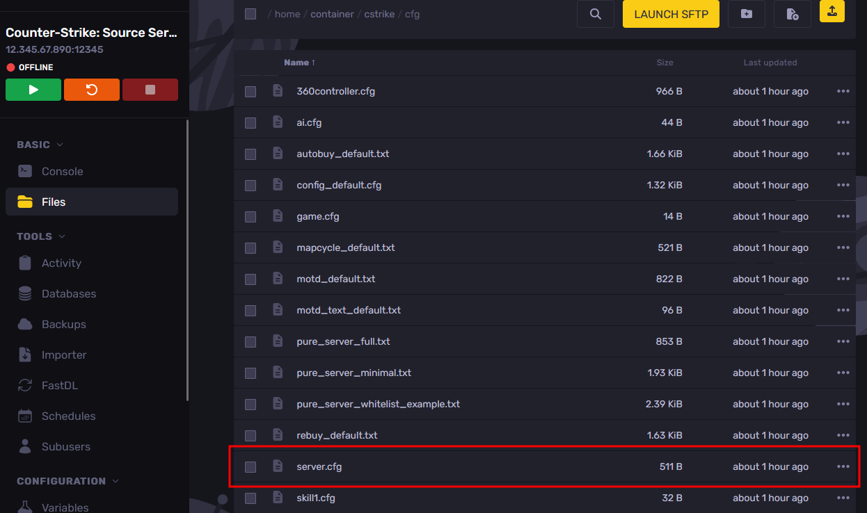 - Go to the Files tab and navigate to the "cstrike/cfg" folder, then open the "server.cfg" file.