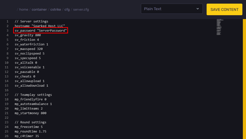 - Under the "sv_password" setting, enter the password that you want players to use to join inside the quotation marks.