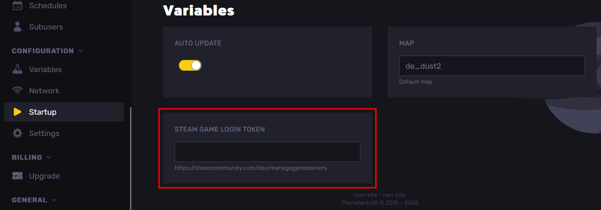 - Go to the Startup Tab and enter the Steam Game Login Token you got earlier.