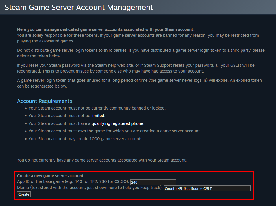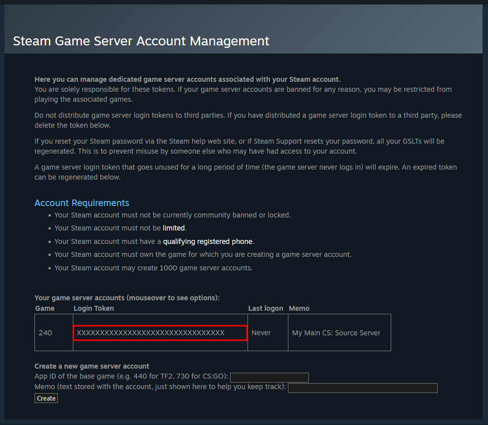 - In the "Create a new game server account" section of the page, set the App ID to "240" (which is Counter-Strike: Source's Steam App ID) and the Memo, which will serve as your note to identify which Game Server Login Token is used for, which will help you when managing GSLTs, then click the Create Button.