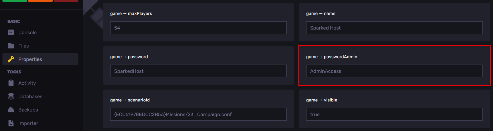 - Look for the "game → passwordAdmin" property, and enter your desired server password, which will be used to grant admin privileges.