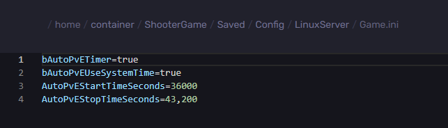 AutoPvEStartTimeSeconds=<seconds>. This value is set in seconds. To calculate it, take the number of hours you want, for example, 10 hours, and multiply by the number of seconds in an hour (3600). So, 10 × 3600 equals 36,000 seconds.