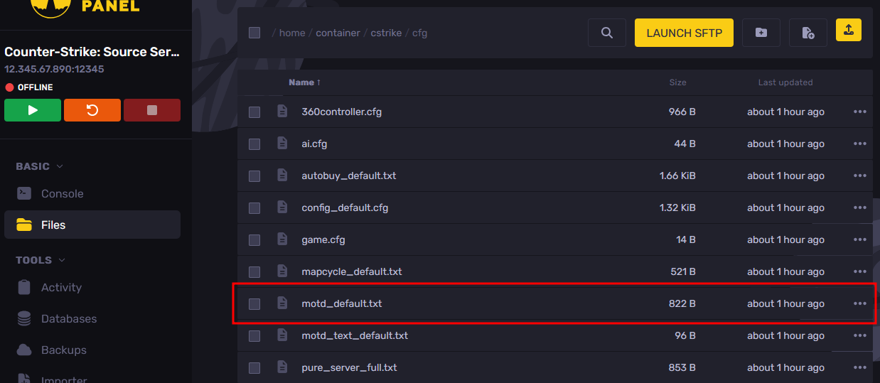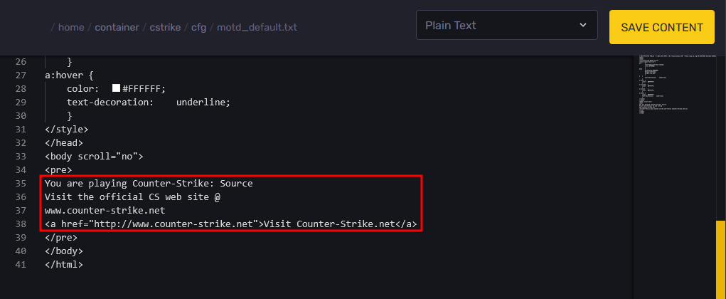 - Go to the Files tab and navigate to the "cstrike/cfg" folder, then open the "motd_default.txt" file.