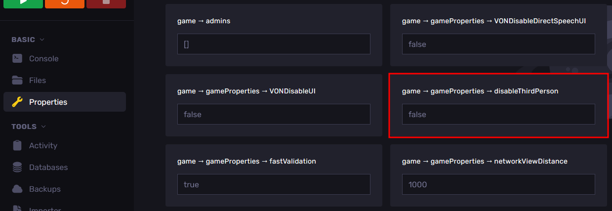 - In the Properties Tab, look for the setting titled "game → gameProperties → disableThirdPerson" and set the value to "true".