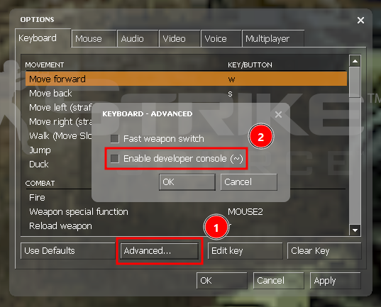 - Click on "Advanced...", then enable the "Enable developer console (~)" option, afterwards click the "OK" buttons to save the changes.