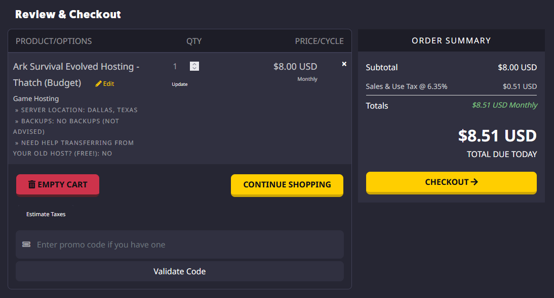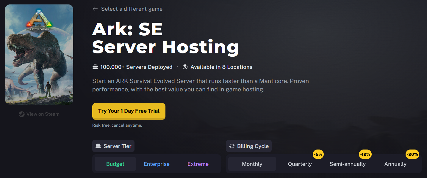 You can also change the Billing Cycle to suit your preference, choose between Monthly, Quarterly, Semi-Annually, or Annually. Longer billing cycles often come with discounted rates, making them a great choice if you plan to host your ARK: Survival Evolved server long-term.