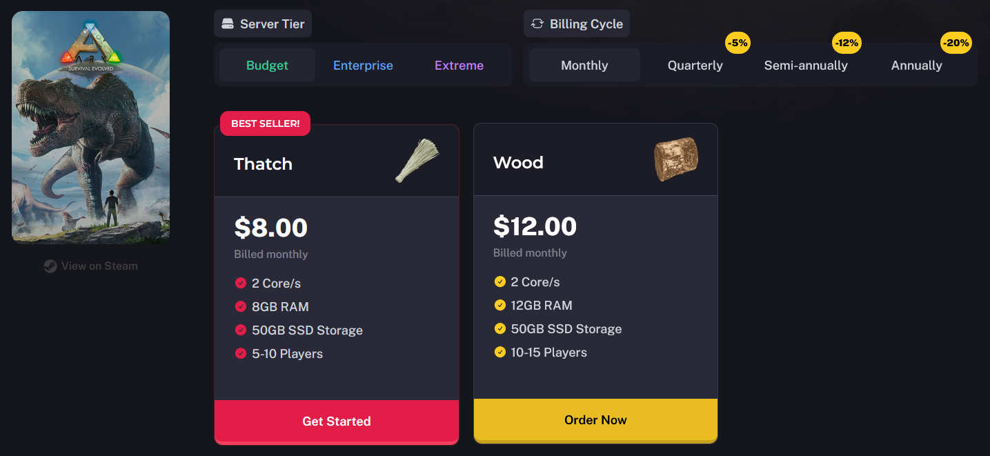 Budget Tier: This tier is ideal for small tribes or casual ARK: Survival Evolved players. It offers reliable hardware and enough power to host a stable survival server for a few friends, supporting essential mods, light base building, and smooth gameplay on standard maps.