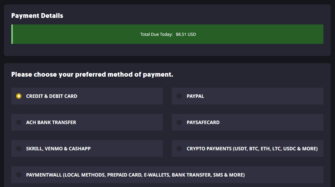 - From there, you can select your preferred payment method and register a Sparked Host Client Area account if you do not already have one.